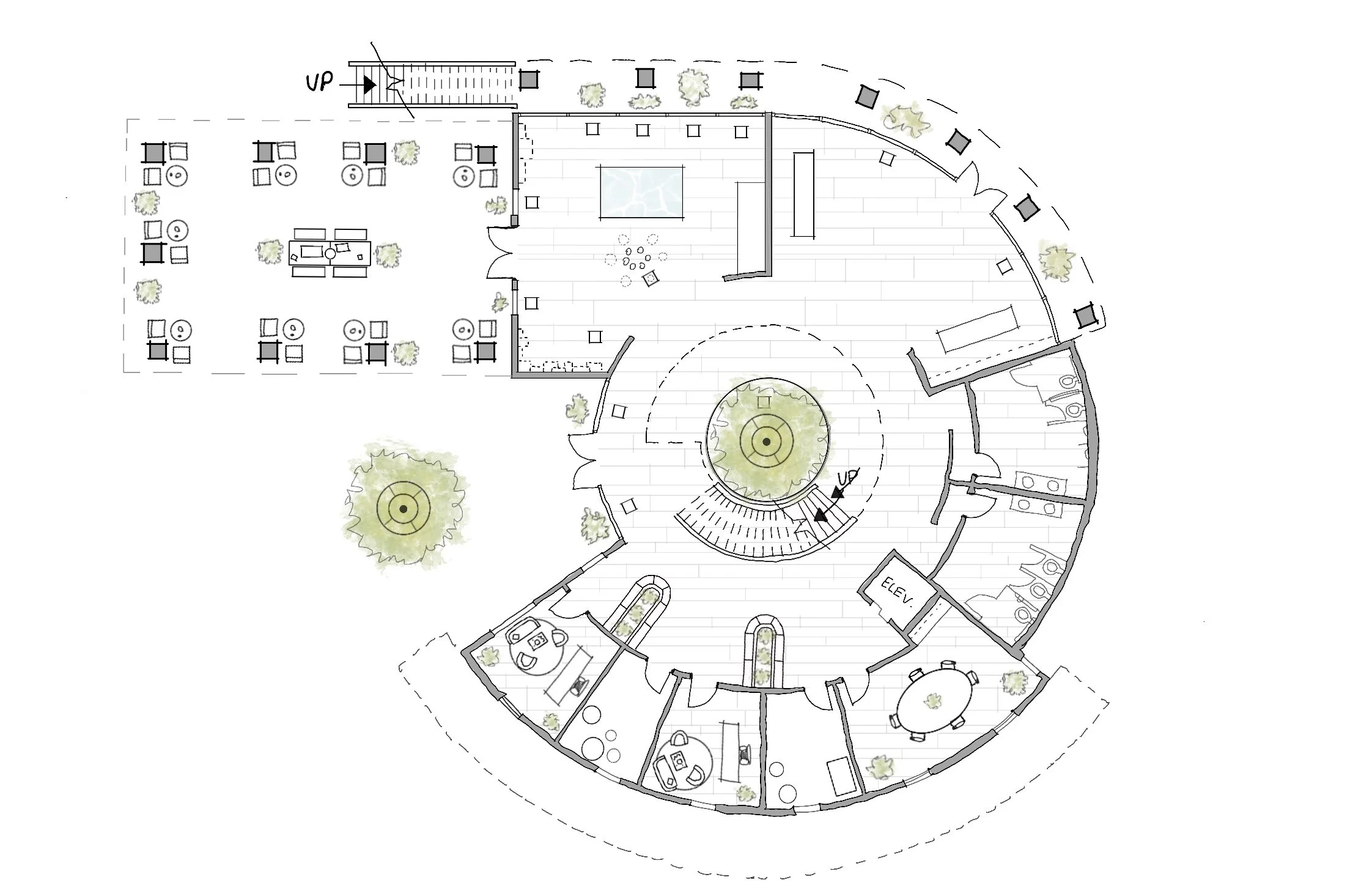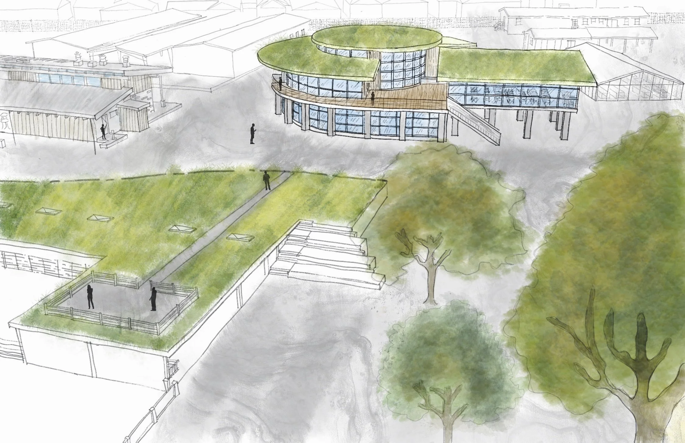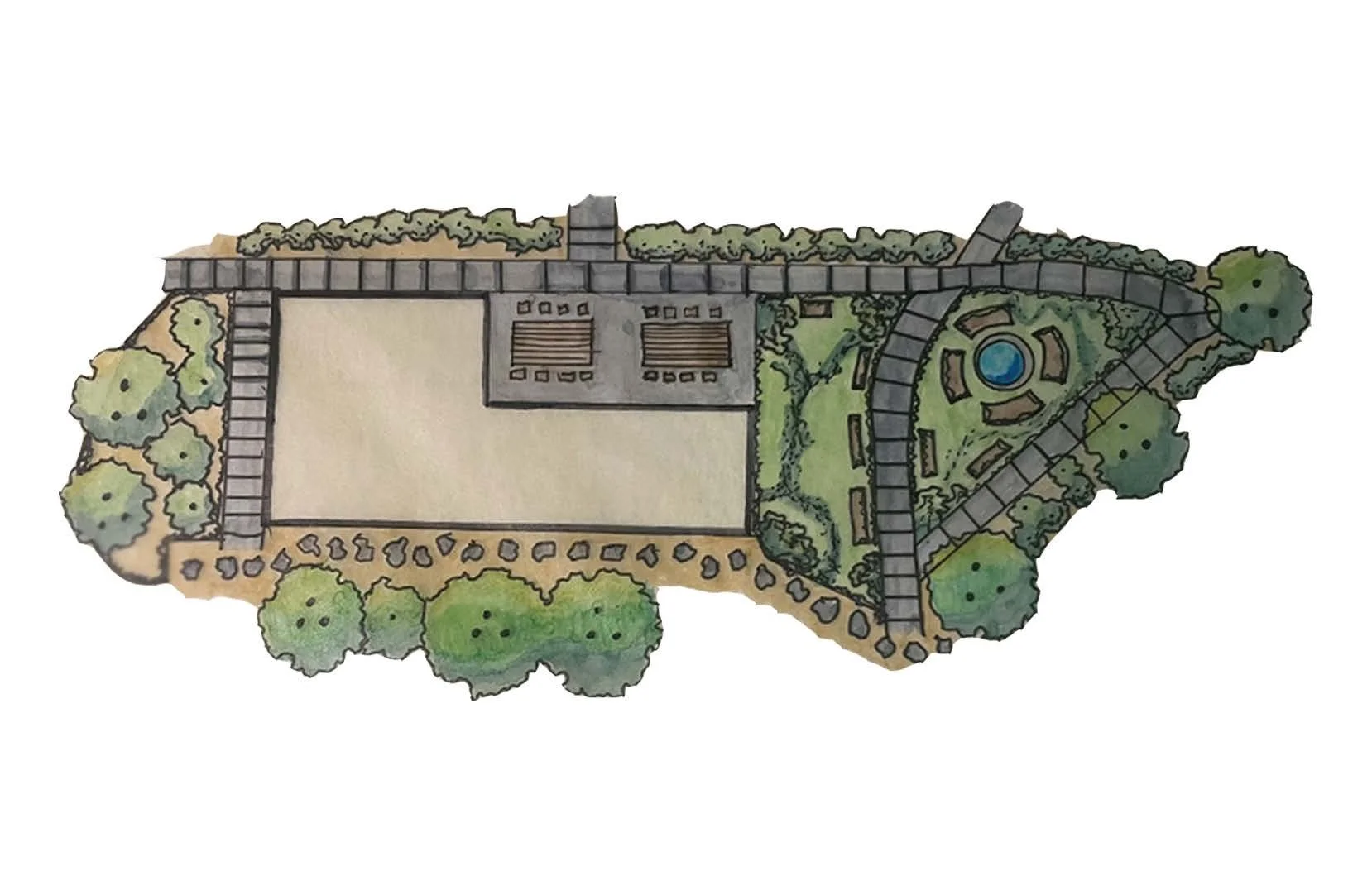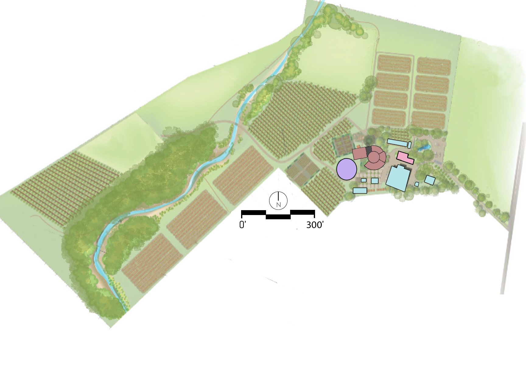 This hand-drawn marker rendering illustrates a site plan for an adjacent farmstead market building where on-site agricultural goods are sold. The design emphasizes a relaxed visitor experience, featuring a meandering path with designated rest areas and integrated water features. These elements were intended to create moments of pause, enhance the sensory quality of the environment, and immerse visitors in the surrounding landscape while encouraging interaction with local wildlife. The drawing highlights my traditional rendering skills and ability to communicate atmosphere and spatial intent through hand graphics.