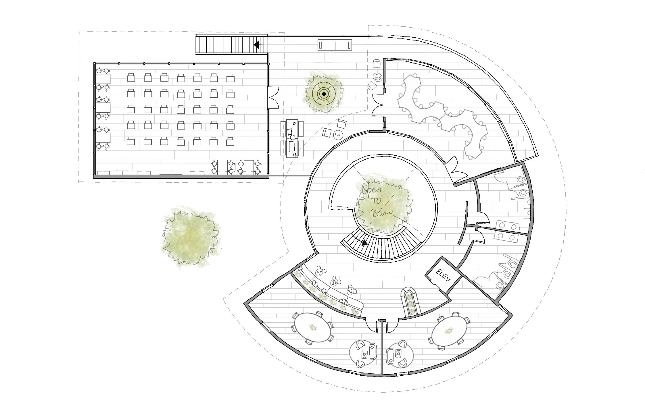 Originally developed in 2021 and revised in 2024, this agricultural education center located along the American River reflects both my early design interests and my growth in graphic communication. Although the initial model and Revit drawings were created while I was still developing my technical skills, I revisited the project and traced over earlier digital plans, sections, and perspectives to strengthen the final graphics. This process enhanced the design’s presentation and storytelling, demonstrating my ability to refine earlier work and transform a foundational project into a cohesive, visually compelling proposal.